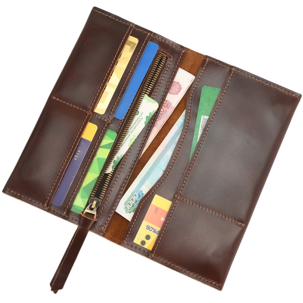 Портмоне вместит в себя много наличных денег, монеты в специальном отделении на молнии, пластиковые карты и даже чеки от покупок в магазинах. Все отделения с подкладом, аккуратно прострочены.