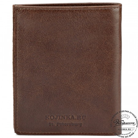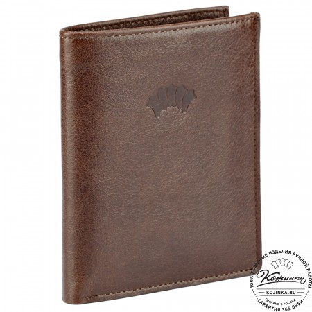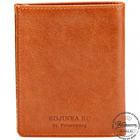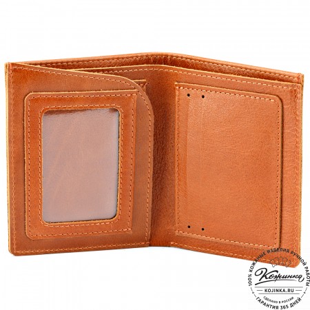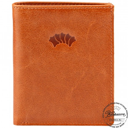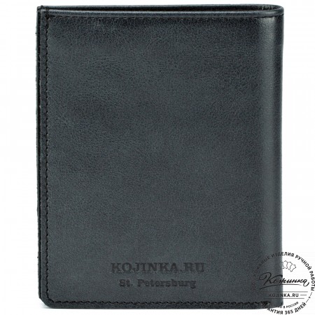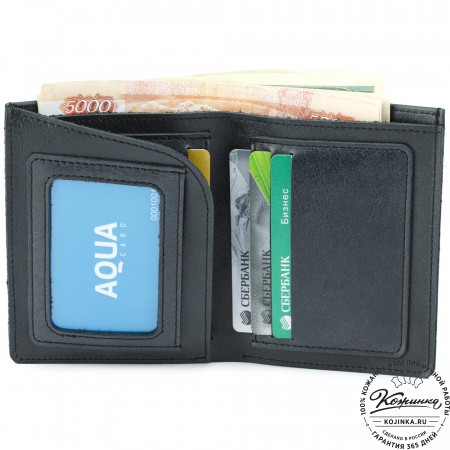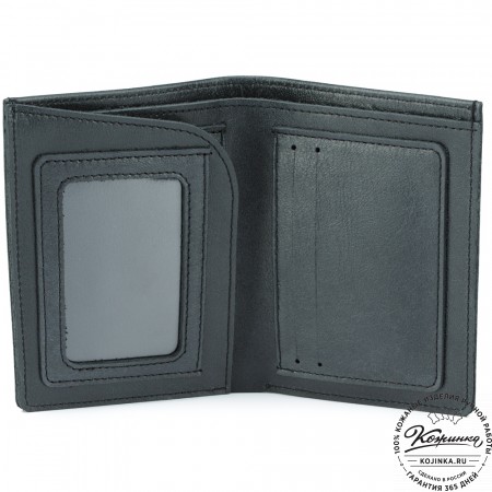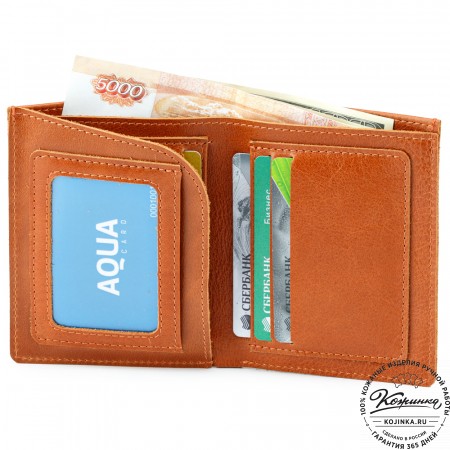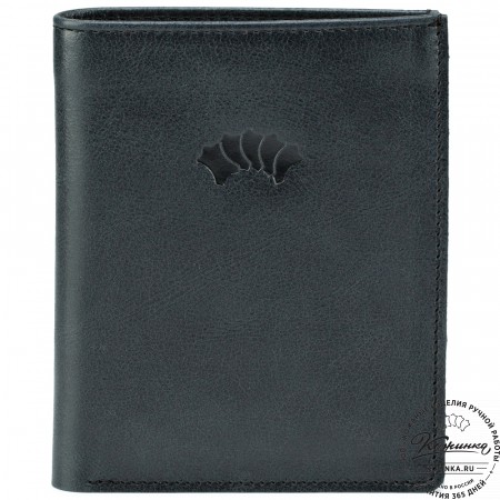 Этот купюрник в три сложения закрывается на хлястик с кнопкой. Внутри распологаются: откидное отделение для купюр и три кармана для карт.