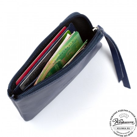 Внутри расположено отделение для купюр с перегородкой, на перегородке имеются карманы для карт, потайные карманы и пластиковый карман, отделанный кожей.