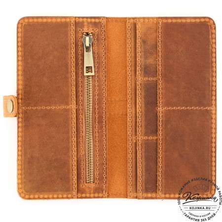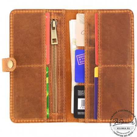 Эта модель очень функциональна - множество отделений позволяет удобно расположить большое количество кредитных карт и купюр, а также водительское удостоверение. Дополнительный отсек для мелочи. Портмоне закрывается на язычок с кнопкой.
