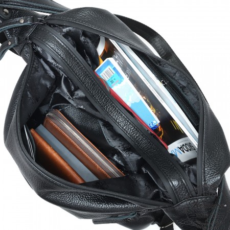Приятно удивляет качество оформления - рюкзак выполнен из натуральной кожи черного цвета. По бокам сумки снаружи имеются карман на молнии для мелочей и с другой стороны скрытый карман на кнопке под кожаным клапаном. Внутри сумки черная подкладка высокого качества. Имеется карман для телефона.