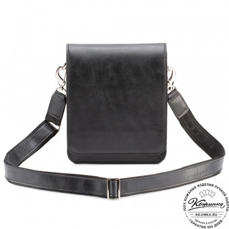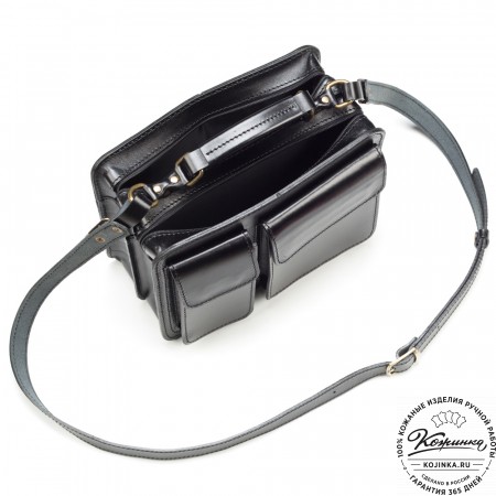 Прочный плечевой ремень из кожи и тканого полиэстера регулируется по длине.