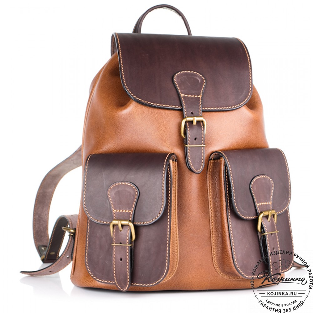 Классический рюкзак из толстой прочной кожи. Одно отделение и два наружных кармашка.