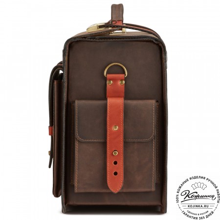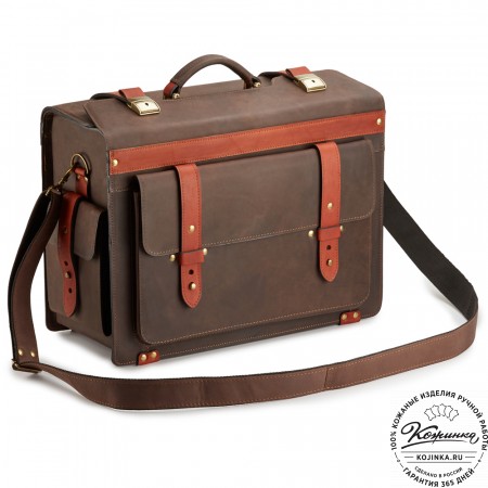 У портфеля прочная анатомическая ручка и съемный плечевой ремень из кожи, который крепится по бокам ременными пряжками.