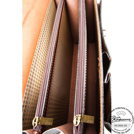 Внутри портфеля три отделения. Среднее из них закрывается на молнию.