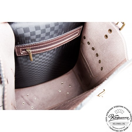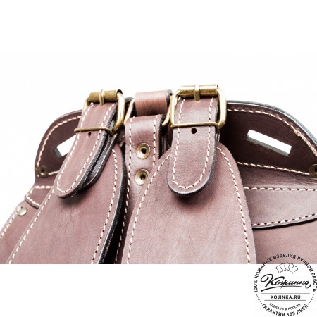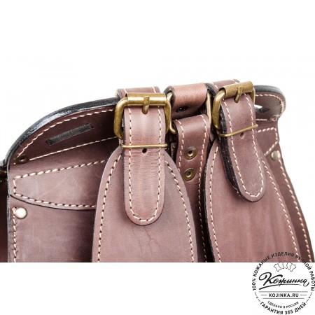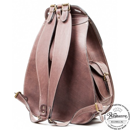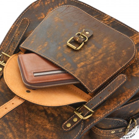 Внутри одно вместительное отделение, открывается клапаном сверху. Объёмный накладной карман ниже клапана на классических замках. Под основным клапаном карман на липучках. Два боковых кармана по бокам рюкзака. Удобные кожаные ремни - стяжки по бокам (можно использовать для ношения или крепления чего-либо).