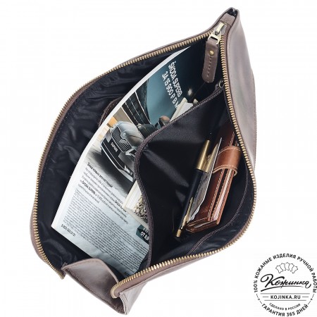 Внутри несколько карманов: на задней стенке один большой карман на молнии и несколько открытых кармашков для телефона, ручек, визиток или паспорта.