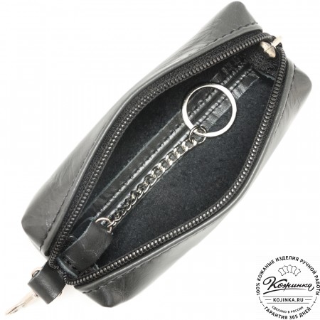 Внутри на кожаных петлях расположены металлическое кольцо для ключей и небольшой металлический карабин.