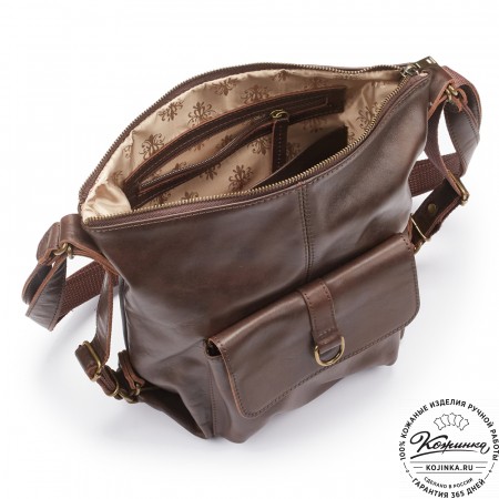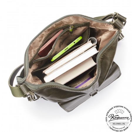 Одно вместительное отделение под формат А4, карман на молнии и карман для телефона внутри. Карман на молнии снаружи.